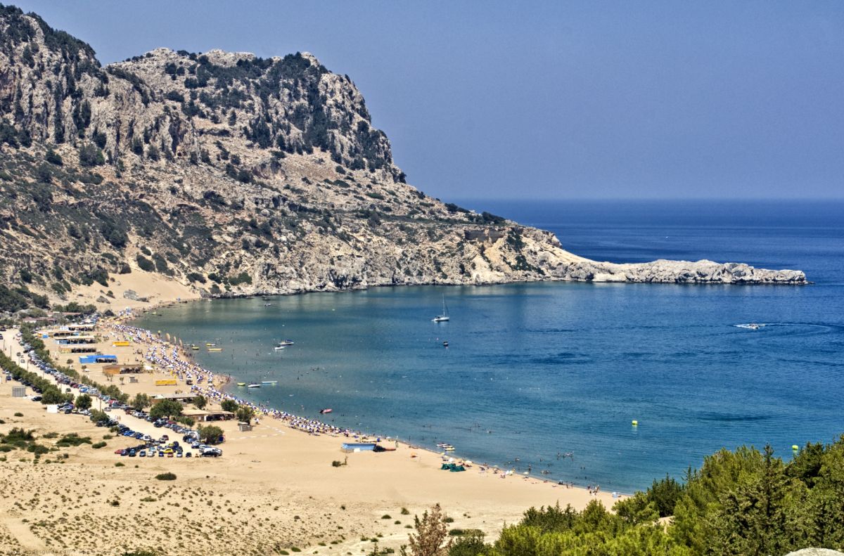 Tsambika is an 800 meters long beach of fine pure sand, gently shelving on the east coast of the island of Rhodos. Distant at about 26 km from the capital, this pure-sand beach has survived from permanent development as most of the land is owned by the Orthodox Church. In fact, at the north end of the beach, on a sharp peak overlooking the beach, there is the church of Panagià Tsambika.